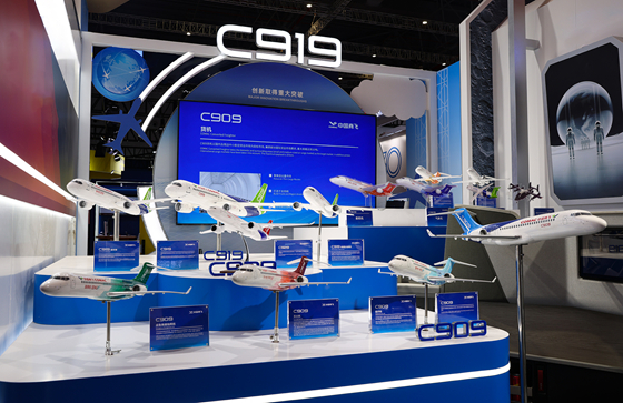 At the stand of COMAC, 1:32 mockups of C909 and C919 baseline aircraft, 1:50 mockups of C909 aircraft derivatives, 1:50 mockups of C919 extended version and shorten version aircraft, and 1:100 mockups of C929 aircraft were intensively showcased, and related products such as reclining first class/business class seats of C919 aircraft were also presented.